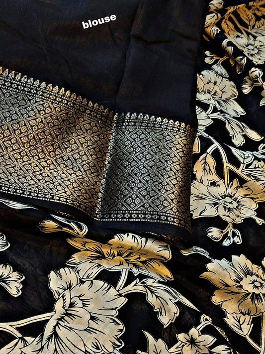 Dola Silk Saree with All-Over Floral Design & Gold Weaving Border